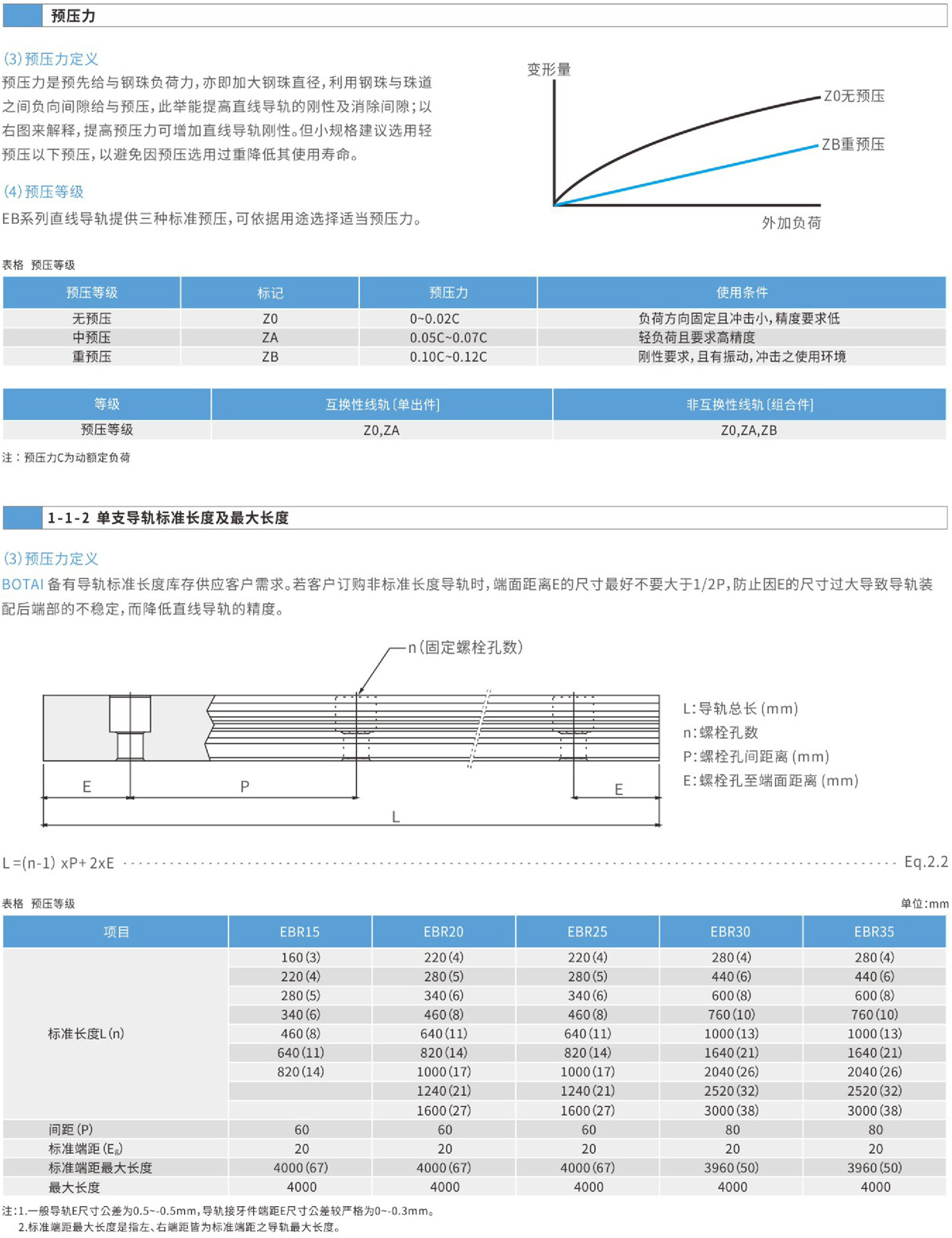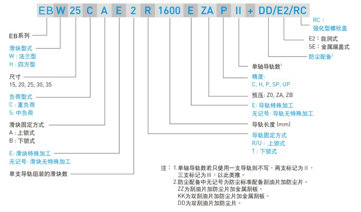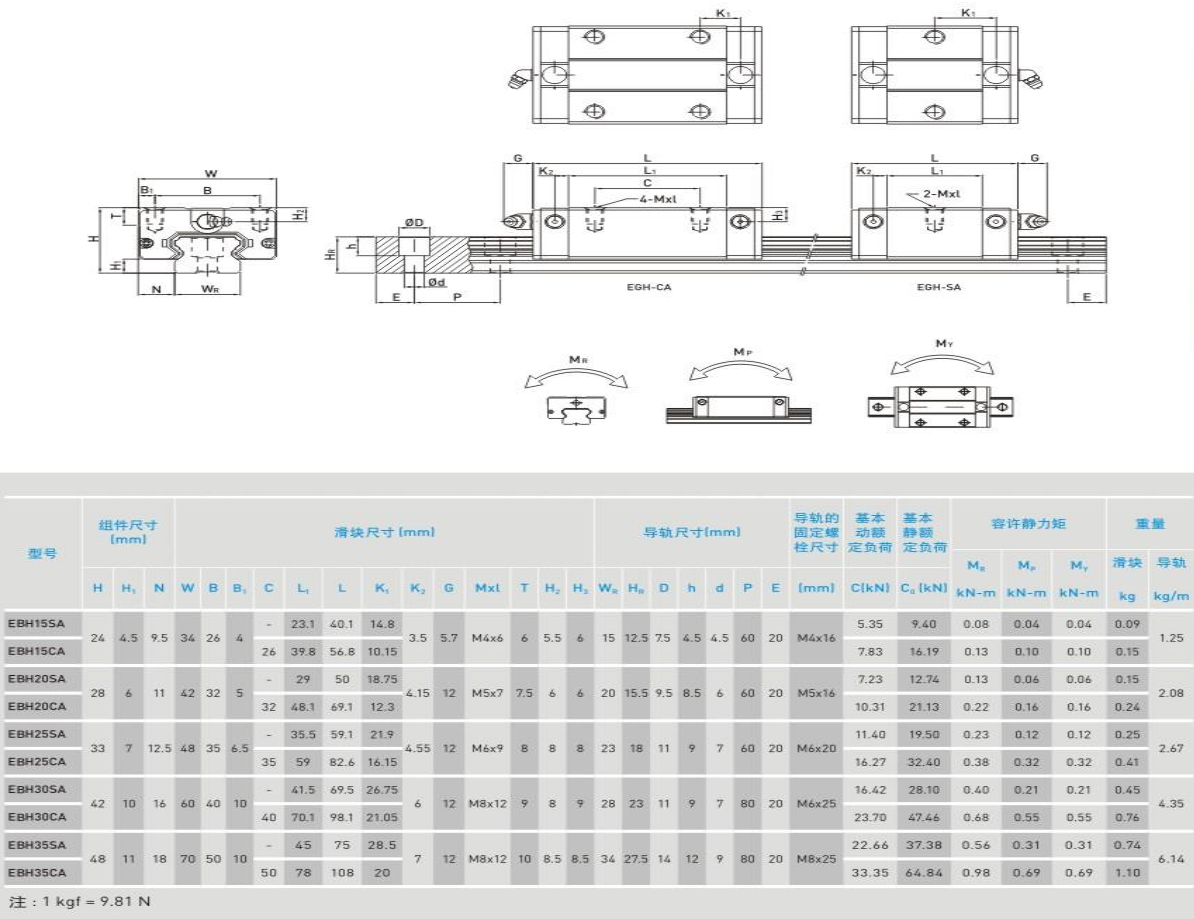 EB系列使用四列钢珠承受负荷设计,使其具备高刚性、高负荷的特性、同时具备四方向等负载特色、及自动调心的功能,可吸收安装面的装配误差,得到高精度的诉求;加上降低组合高度及缩短滑块长度,非常适合高速自动化产业机械及空间要求的小型设备使用。滑块上设有钢珠保持器以防止钢珠脱落,此设计不仅方便客户安装直线导轨,当取下滑块时亦不会有钢珠脱落的情形发生,且在精度允许下具备互换性。